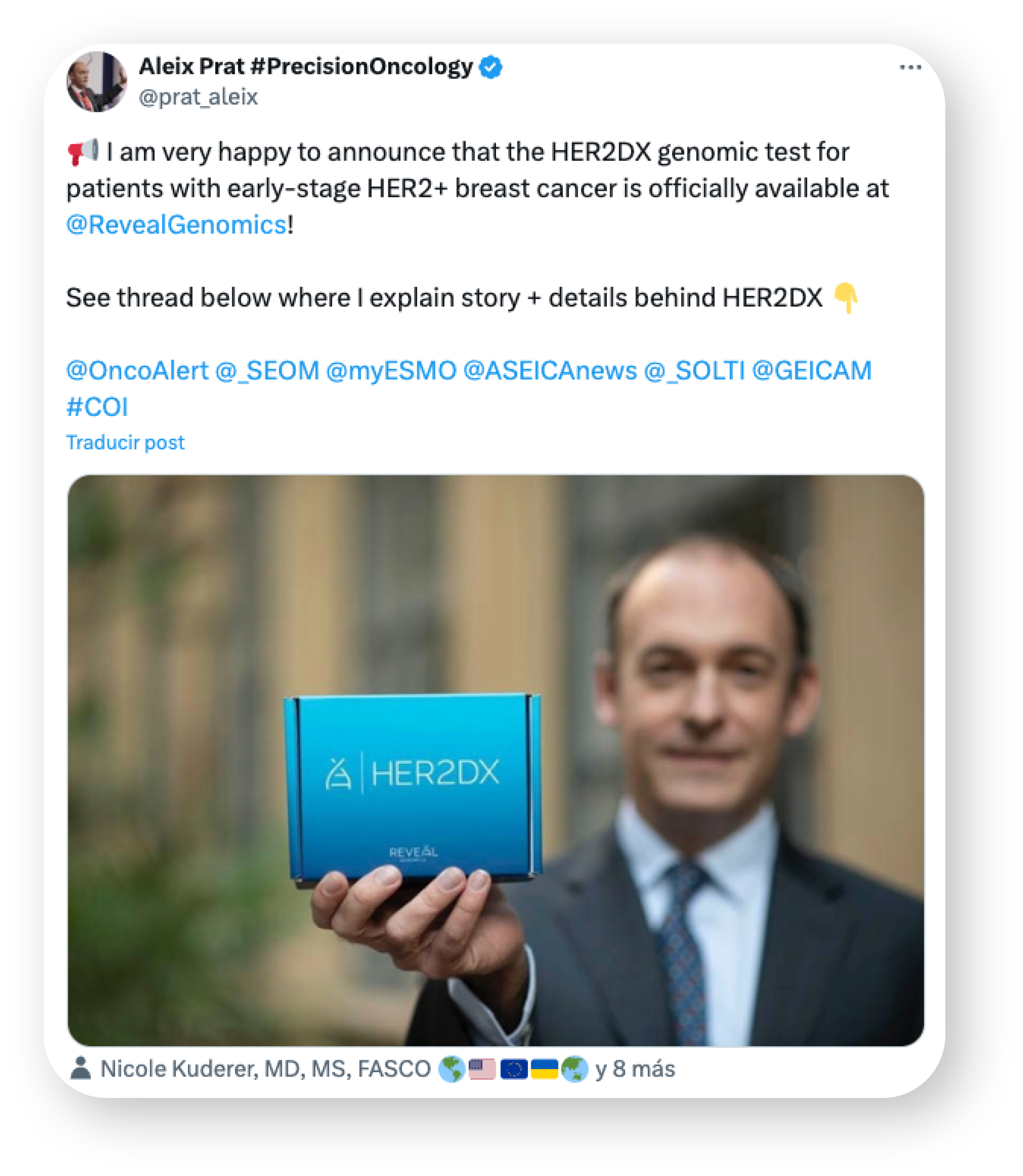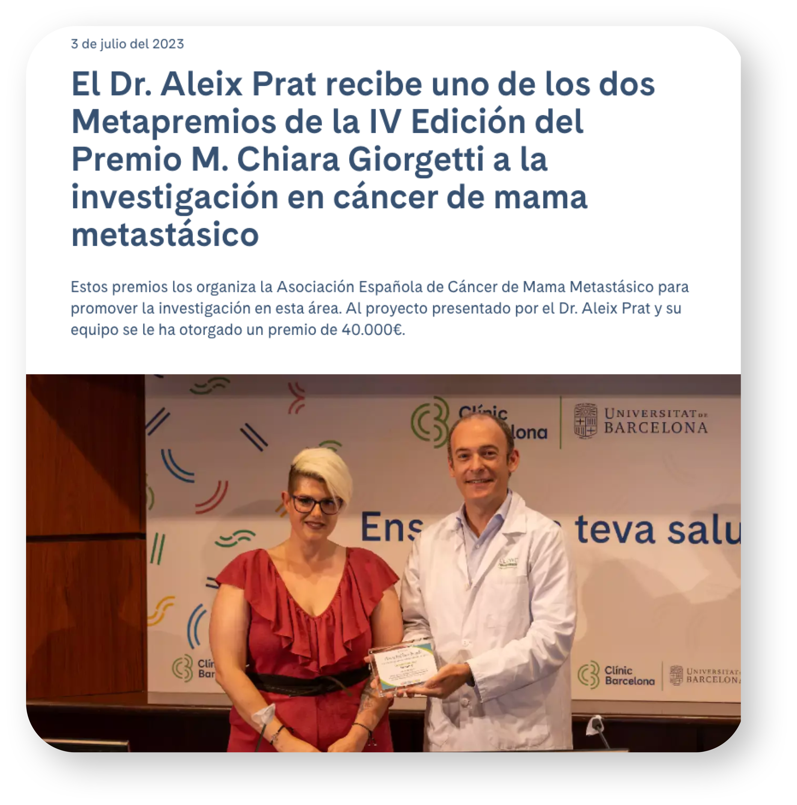 El Dr. Prat es profesor titular del Departamento de Medicina de la Universitat de Barcelona y tiene un laboratorio de investigación traslacional en el Hospital Clínic, donde ha liderado el desarrollo de pruebas diagnósticas innovadoras como HER2DX y TNBC-DX. Ha publicado más de 300 artículos en revistas científicas de alto impacto, ha liderado numerosos ensayos clínicos y ha sido y es ponente invitado habitual en las principales conferencias por todo el mundo.