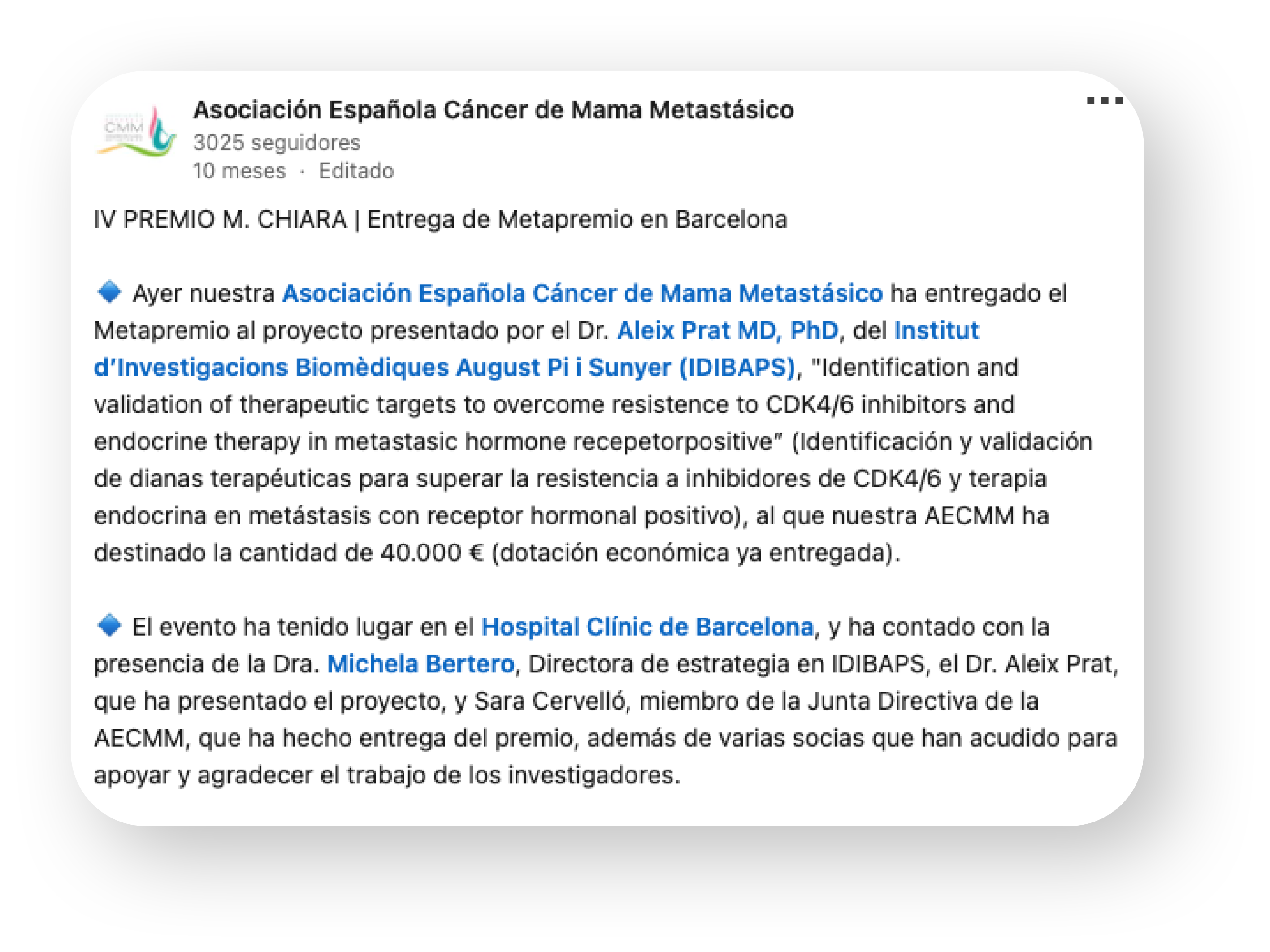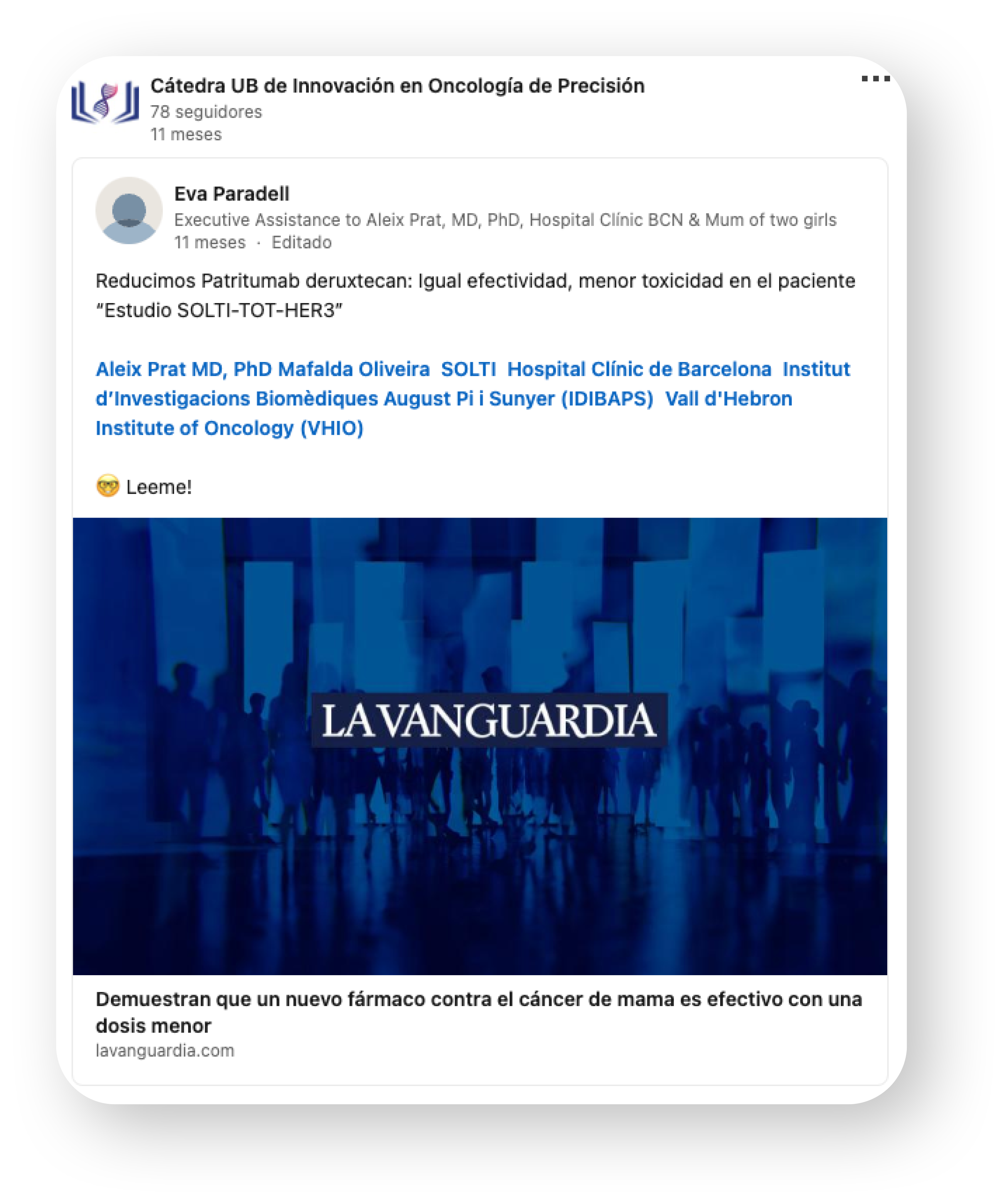 Con su visión 360° del campo oncológico, que abarca desde la investigación básica y traslacional hasta la aplicación clínica y el desarrollo de nuevas tecnologías, el Dr. Prat trabaja incansablemente para mejorar el tratamiento y el pronóstico de los pacientes con cáncer.
